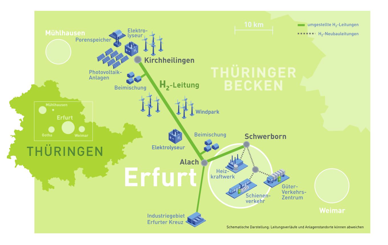 Für Erfurt wird das saubere und am häufigsten vorkommende chemische Element Wasserstoff an Bedeutung gewinnen. Als eines der sogenannten „Grünen Gase“, wird dieser Wasserstoff unter der Verwendung von erneuerbaren Energien hergestellt und kann fossile Brennstoffe mit ihren CO2-Emissionen langfristig ersetzen.